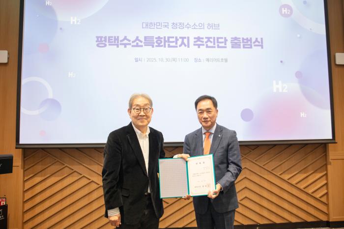 왼쪽부터 평택수소특화단지 추진단장으로 임명된 평택대학교 이계안 이사장, 정장선 평택시장. (사진=평택시 제공)[평택=주간시민광장] 조종건 기자한눈에 보는 한 줄 요약● 산·학·연·관 20여 기관 참여…