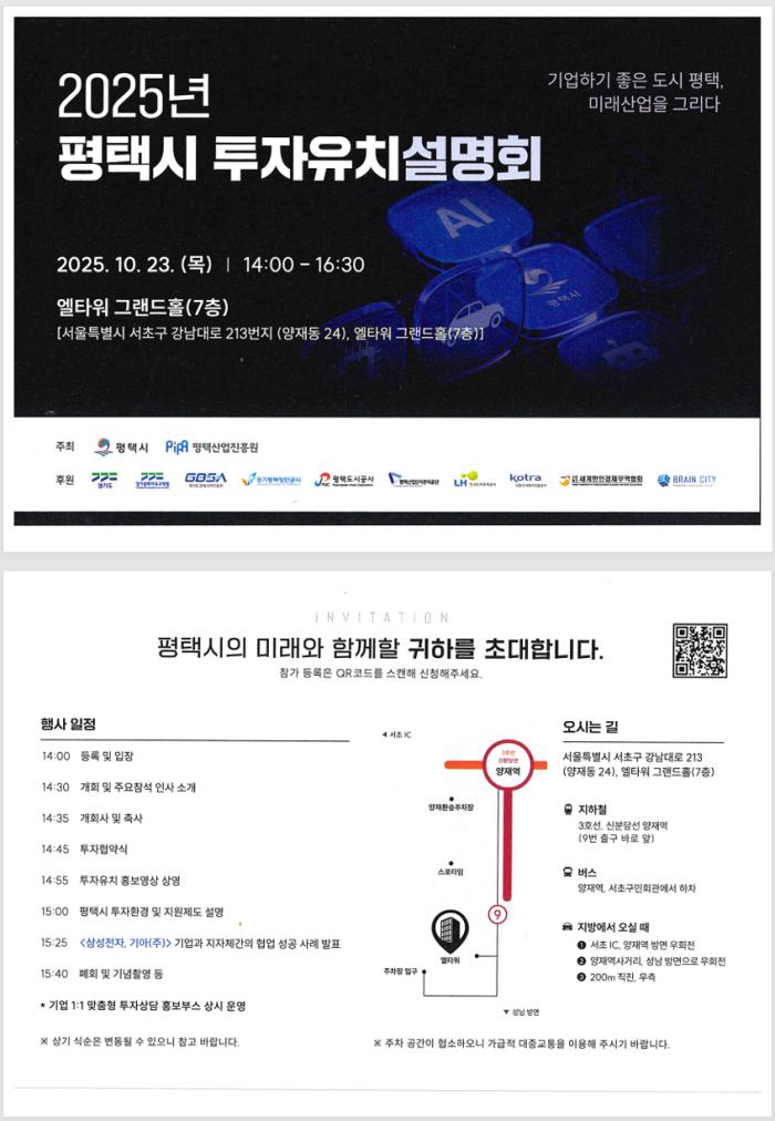평택시 투자유치행사 안내 ⓒ평택시 제공한눈에 보는 핵심 요약• 일시: 10월 23일(목) 14:00• 장소: 서울 강남 엘타워 그랜드홀• 규모 : 국내외 기업 150개사 300여 명 참석• 주제 : ‘기업하기 좋은 도…
