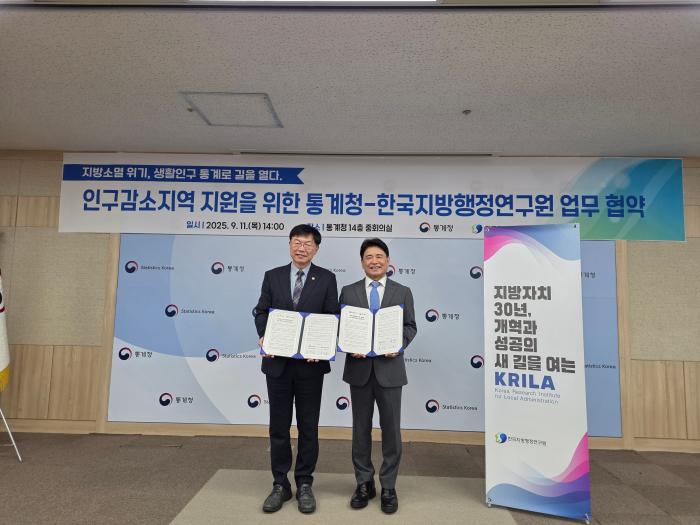 - 위 사진: 통계청과 한국지방행정연구원이 11일 ‘인구감소지역 정책 지원을 위한 업무협약’을 체결했다. 오른쪽부터 육동일 한국지방행정연구원장, 안형준 통계청장[세종=주간시민광장] 조요한 기자 = 통…