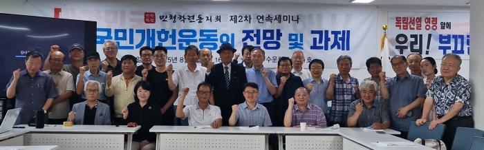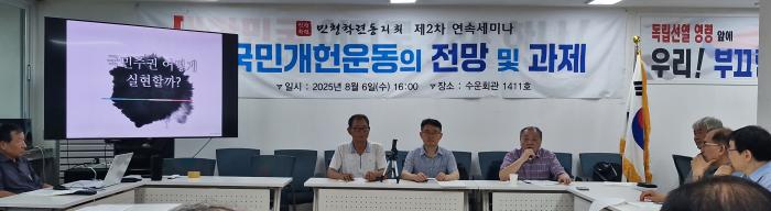 [평택=주간시민광장] 약 50년 전 유신체제에 맞서 민주화 투쟁에 나섰던 민청학련 사건 관련 구속자와 동지들로 구성된 민청학련동지회가 지난 8월 6일 오후 4시, 서울 종로구 경운동 천도교 수운회관에서 ‘국민개헌운동의 현황과 전망 및 과제’를 주제로 공개 세미나를 개최했다. 이번 행사는 국민주권 행사 보장과 직접민주제 단계적 도입을 위한 실질적 방안을 논의하기 위해 마련됐으며, 약 35명이 참석해 2시간가량 열띤 토론이 이어졌다.