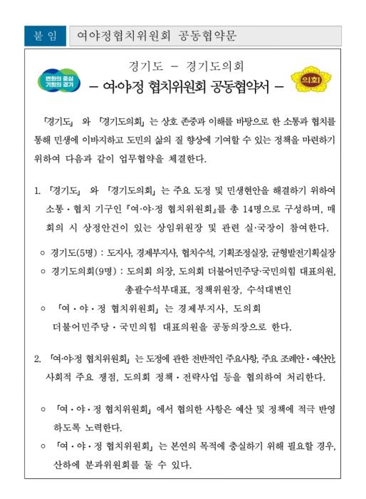 13일 경기도지사 공관이었던 ‘도담소’에서 열린 협약식에는 김동연 경기도지사와 김진경 도의회 의장, 최종현 더불어민주당 대표, 백현종 국민의힘 대표가 참석해 공동협약서에 서명했다. 이어 경기도의회 12층에 새로 마련된 협치위 사무실에서 현판식이 진행됐다.