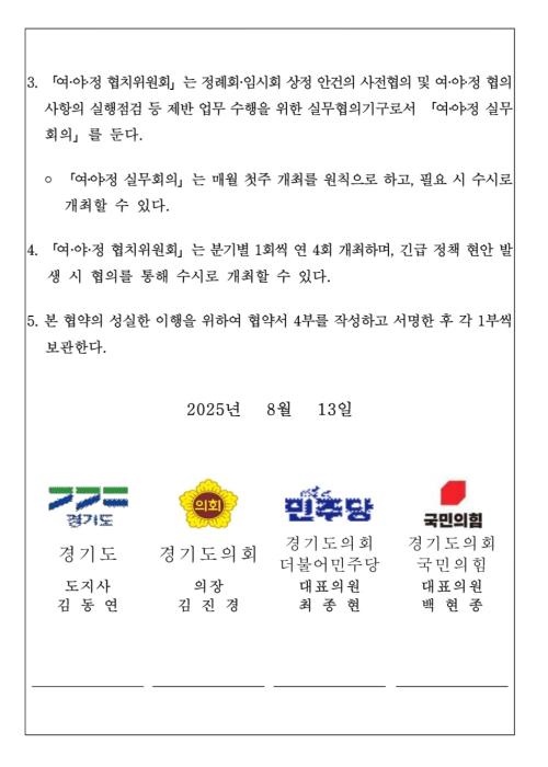 여야정협치위원회는 2022년 ‘여야정협의체’로 출범했으나, 2023년 확대 개편 후 활동이 지지부진했다. 그러나 지난 6월 김동연 지사와 의장단, 여야 대표가 함께한 이른바 ‘치맥 회동’을 계기로 복원 논의에 불씨가 붙었고, 이번 협약으로 성과를 맺게 됐다.
