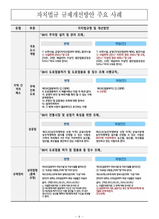 이밖에도 골목형 상점가 지정 요건, 농민 직영매장 신청 요건 완화 등 상공업 규제 개선 과제와 상위법-자치법규 불일치를 바로잡는 규제 정비 과제 20건, 이해관계자 협의가 필요한 중장기 검토 과제 5건이 함께 포함됐다.