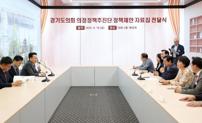 [경기도의회=주간시민광장] 서동화 기자 = 경기도의회 의정정책추진단이 경기도와 도교육청에 ‘정책제안 자료집’을 전달하며 도민 중심 협치 의정의 성과를 공식화했다. 약 900쪽 분량의 자료집에는 도와 교육청 소관 276건의 정책 현안이 담겼으며, 집행부의 적극적인 수용과 실행을 촉구했다.