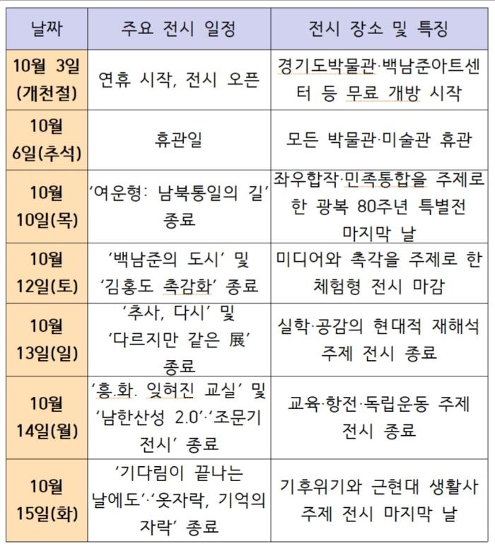[수원=주간시민광장] 백미현 기자 = 경기도는 개천절부터 한글날까지 이어지는 긴 추석 연휴 기간, 도내 주요 박물관과 미술관에서 10가지 주제의 기획전시를 무료로 관람할 수 있는 ‘문화 연휴 주간’을 운영한다.