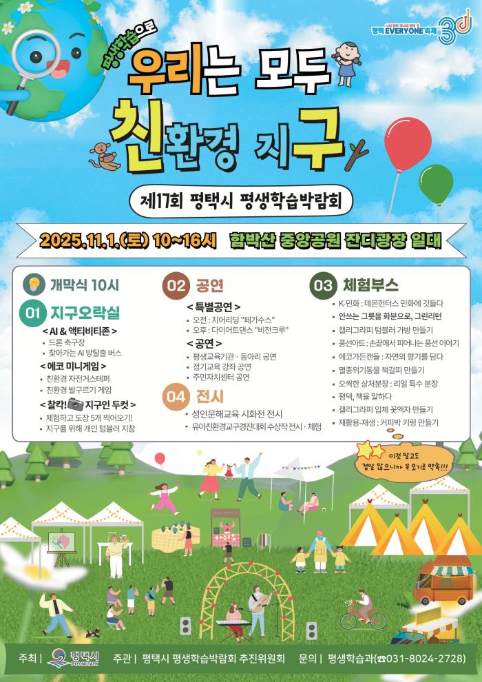 정영순 평택시 평생학습과장은 “이번 박람회는 아이와 어른이 함께 배우고 실천하는 친환경 미래형 학습 축제”라며 “시민들이 평생학습의 즐거움과 지속가능한 지구의 가치를 함께 느낄 수 있는 특별한 시간이 되길 바란다”고 전했다.