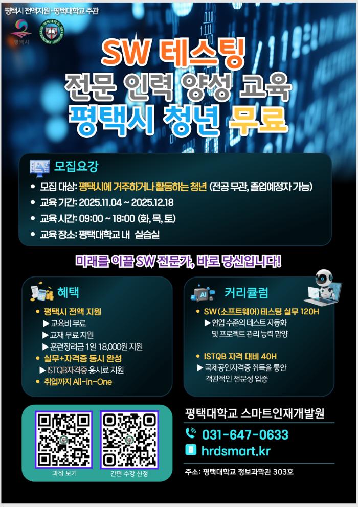 이번 교육은 평택시가 전액 비용을 지원하며, Python 실습, API 자동화 테스트, 협업툴(Jira·Git) 활용, 국제자격증(ISTQB) 대비, 1:1 취업 컨설팅 등 실무 중심 커리큘럼으로 구성됐다.