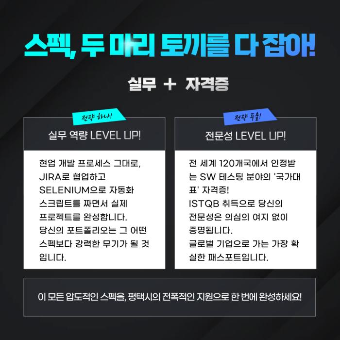• 특징: 실무 프로젝트 + 국제공인자격증(ISTQB) + 1:1 취업 컨설팅