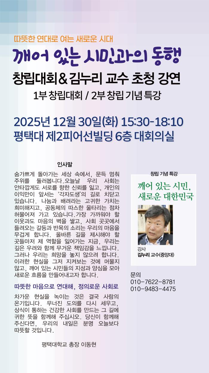 이번 행사는 12월 30일(화) 오후 3시 30분부터 6시 10분까지, 평택대학교 제2피어선빌딩 6층 대회의실에서 열린다. 시민 누구나 참여할 수 있으며, 창립대회와 기념 특강을 끝으로 공식 출범 절차가 마무리된다. 이 자리는 단순한 행사 참석이 아니라, 지금의 사회를 그대로 둘 것인지에 대한 시민 각자의 응답을 요구하는 자리다.