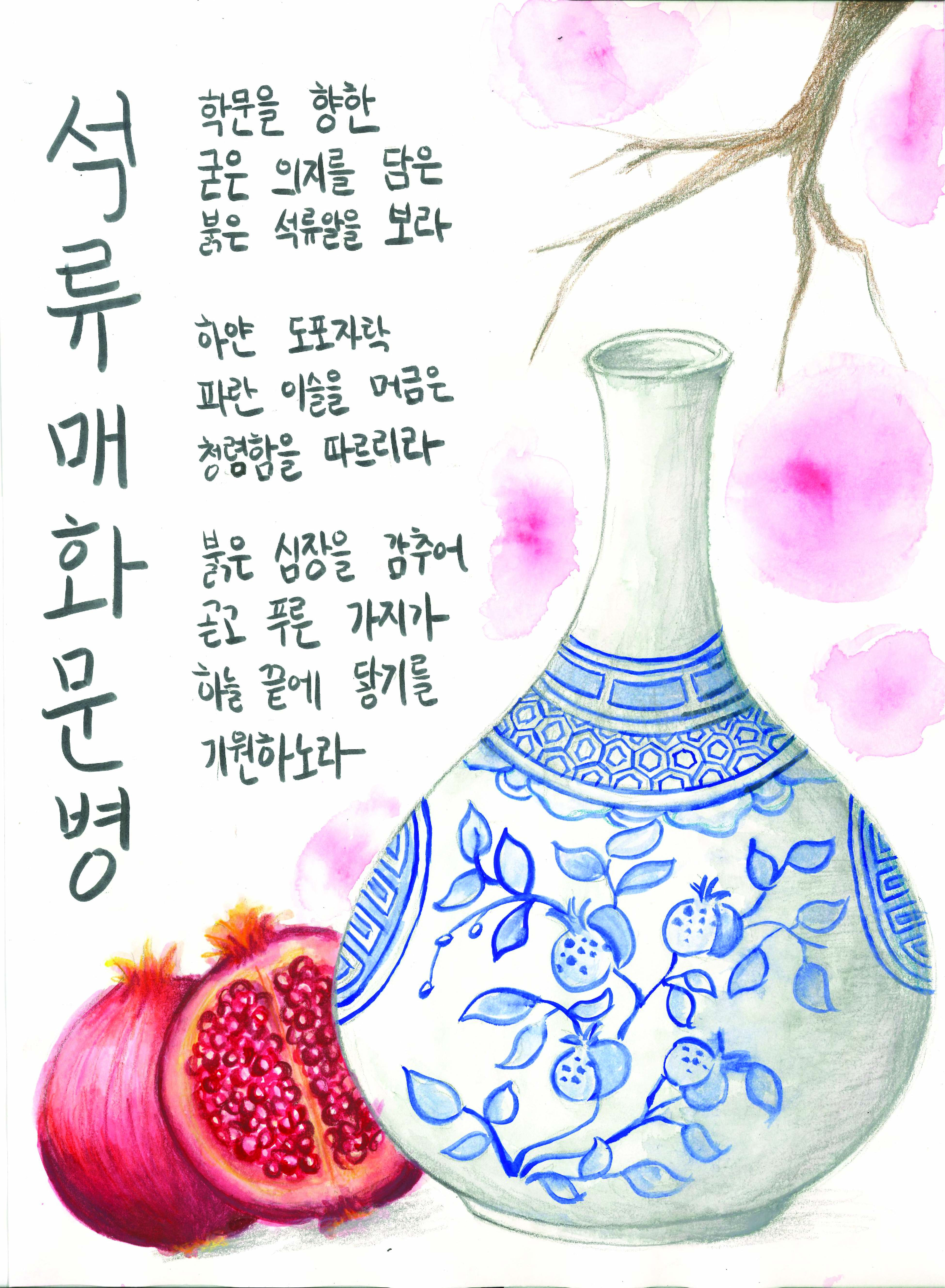 글·그림(시화) 부문 대상에는 이세빈(매양중 1) 학생의 ‘선비와 석류 매화문병’이 선정됐다. 이 작품은 학문의 의지를 담은 열정을 석류와 빨간색을 비유해 표현하고, 선비의 청렴한 이미지는 백자의 청아함과 푸른 선, 무늬, 색상 등으로 훌륭하게 표현했다.