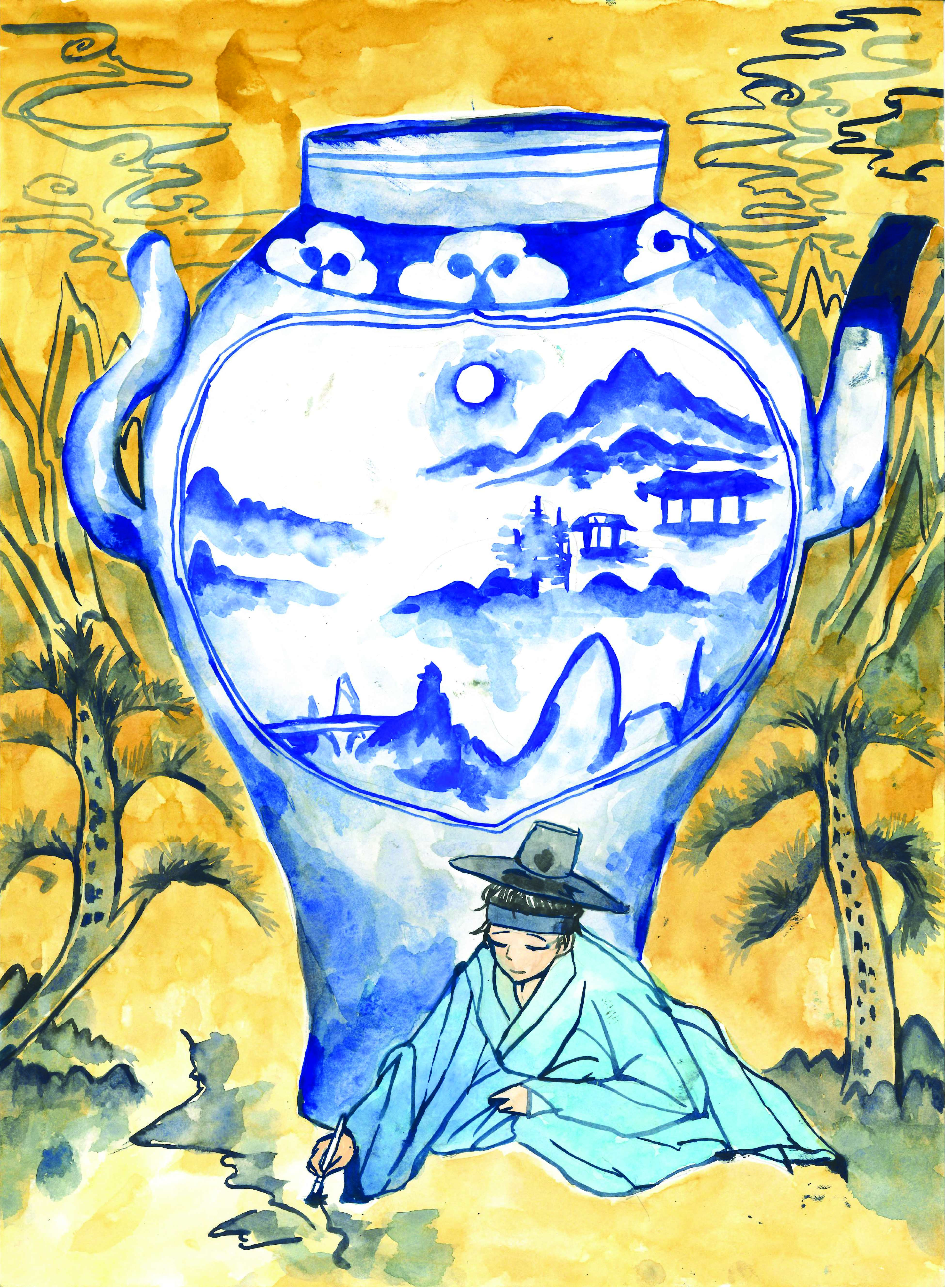그림 부문 대상은 오채린(서일초 6) 학생의 ‘그림을 그리는 선비’가 차지했다. 백자청화 산수문 수주(水注)를 그린 뒤 앞에는 그림을 그리고 있는 선비를, 뒤에는 옛날 그림 느낌의 구름, 산, 소나무를 그려 창작·제작 의도를 뚜렷하게 표현했다.