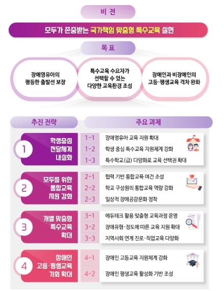 이번 계획은 모두가 존중받는 국가책임 맞춤형 특수교육을 실현하기 위해 4대 추진 전략 아래 11개 주요 과제가 포함되어 있다.