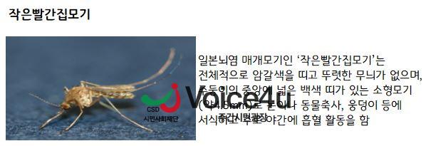 일본뇌염을 전파하는 ‘작은빨간집모기’는 논이나 동물축사, 웅덩이 등에 서식하는 암갈색의 소형모기로 주로 야간에 흡혈 활동을 한다.