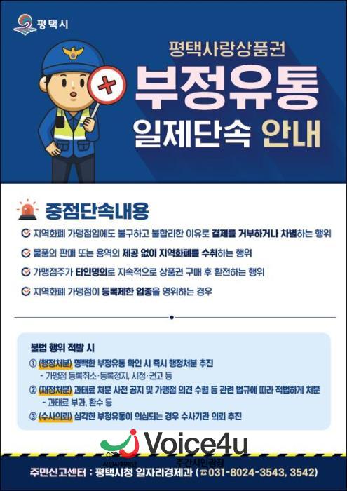 평택시는 2021년 상반기부터 부정 유통 단속을 진행하여 충분한 계도기간을 거쳤다는 점을 고려하여 부정 유통 행위가 적발되면 사안의 경중에 따라 현장 계도·가맹점 등록취소 등 행정처분과 2000만 원 이하의 과태료를 부과하고, 심각한 부정 유통이 의심되는 경우 수사기관 의뢰 등 추가 조치할 계획이다.