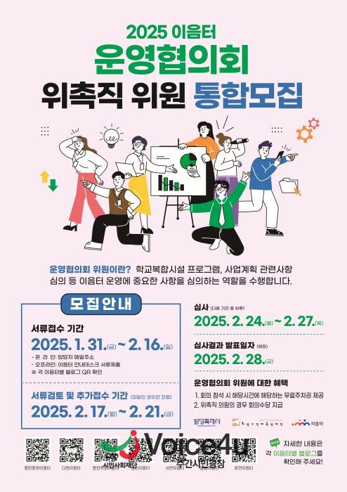 이번에 모집하는 이음터 운영협의회 위원은 학부모, 지역주민, 학생, 교사 4개 분야이며, 모집인원은 7개 이음터 총 48명이다. 운영협의회 위원으로 선정이 되면 이음터의 프로그램, 사업계획 등 운영에 관한 사항을 논의하고 의견을 개진하는 역할을 하게 되며 임기는 1년이다. 지원자격은 학교복합시설 운영에 필요한 전문지식을 갖춘 사람 등이며, 제출서류는 지원서 및 자기소개서 등이다. 접수기간은 1월 31일부터 2월 16일 18시까지이며, 지원 서류는 이음터별 담당자의 이메일로 제출하거나 해당 이음터의 안내데스크에 제출할 수 있다.