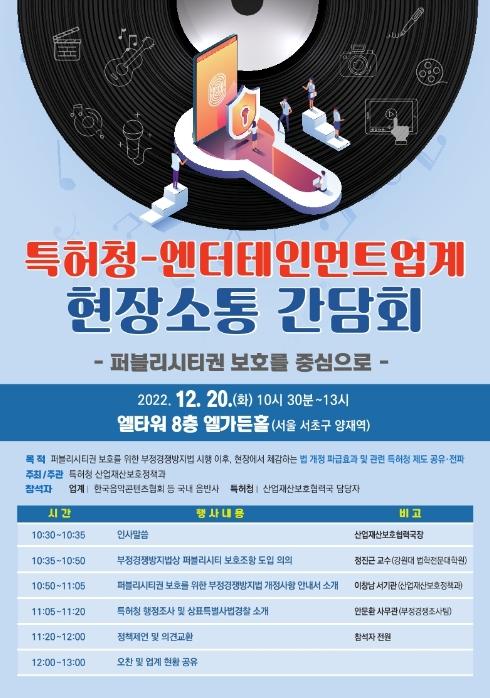 특허청은 퍼블리시티권 보호를 중심으로 한 ‘엔터테인먼트업계와의 현장소통 간담회’를 12월 20일 10시 30분 엘타워(서울 서초구)에서 개최한다고 밝혔다.