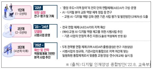 ‘AIEDAP(아이에답)’ 사업은 2022년 사업의 운영 성과 및 결과를 기반으로 2023년부터 권역별 시범사업* 운영을 거쳐, 2025년부터는 지역별 여건에 맞게 사업을 추진·확대할 계획이다.