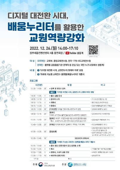‘배움누리터’의 전면 개통을 맞아 ‘디지털 전환(Digital eXchange) 시대, 교원 역량 강화’를 주제로 학술공개토론회(1부 행사), ‘배움누리터’ 개통식(2부 행사) 등을 12월 26일(월)부터 27일(화)까지 이틀간 정부세종컨벤션센터에서 개최한다.