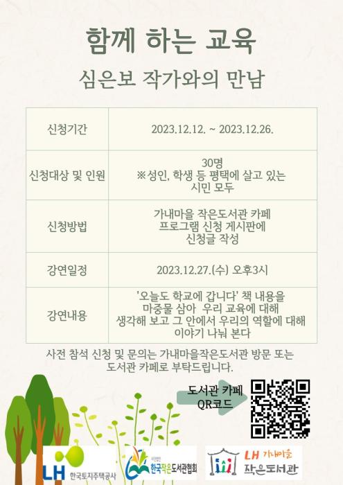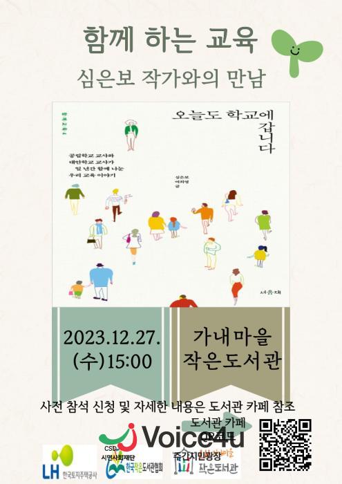 비전1동 행정복지센타 옆에 있는 가내마을(가내마을 5단지) 작은도서관(매니저 이유미)은 오는 12월 27일(수) ‘오늘도 학교에 갑니다’, ‘교실에서 평화 시민 되기’의 심은보 작가 초청 북토크를 개최한다.