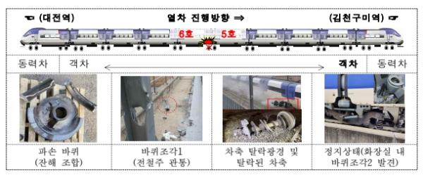 사고원인은 ‘사고바퀴가 제작사양으로 정한 사용한도(마모한계) 도달 이전에 피로파괴로 파손된 것’이며 기여요인은 ‘① 파손 바퀴의 경도 및 인장강도가 제작 사양인 EN 13262 규격의 최소 허용치보다 낮았고, 균열 시작지점에서 미세기공이 군집?분포되어 있었던 점, ② 기존 초음파검사 방식으로는 바퀴 전체 부위의 내부결함을 조기에 발견할 수 없었던 점’이다.