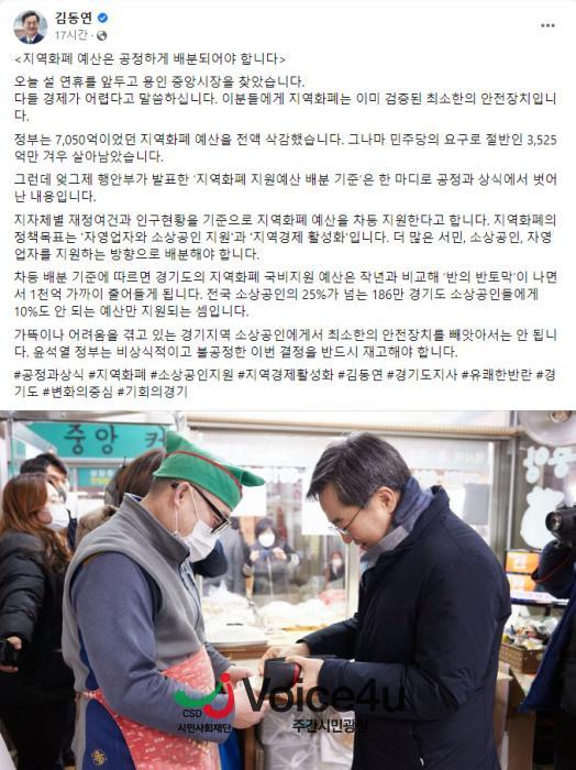 김동연 지사는 지난 18일 밤 자신의 사회관계망서비스(SNS)를 통해 지역화폐 예산은 공정하게 배분돼야 한다. 정부는 750억이었던 지역화폐 예산을 전액 삭감했다그나마 민주당의 요구로 절반인 3525억만 겨우 살아남았는데, 엊그제 행안부가 발표한 지역화폐 지원예산 배분 기준은 한 마디로 공정과 상식에서 벗어난 내용이라고 지적했다.