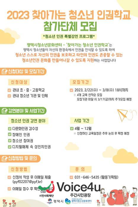평택시청소년문화센터(센터장 곽지숙)에서는 『2023 찾아가는 청소년 인권학교』 참가 단체를 모집한다. 『찾아가는 청소년 인권학교』는 지난 2019년부터 관내 청소년들이 생활 환경 속에서 스스로 인권을 보호하고 타인의 인권도 소중히 여기는 ‘인권 존중 문화’를 만들어 나갈 수 있도록 체험형 교육을 지원하는 사업이다.