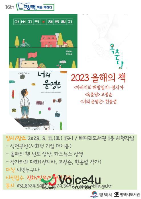 16년째를 맞이하는 「평택, 책을 택하다」 올해의 책은 정지아의 <아버지의 해방일지>, 고정순의 <옥춘당>, 한윤섭의 <너의 운명은>으로 작가와의 대화를 통해 이날 시민들과 첫 만남의 자리를 갖게 된다.