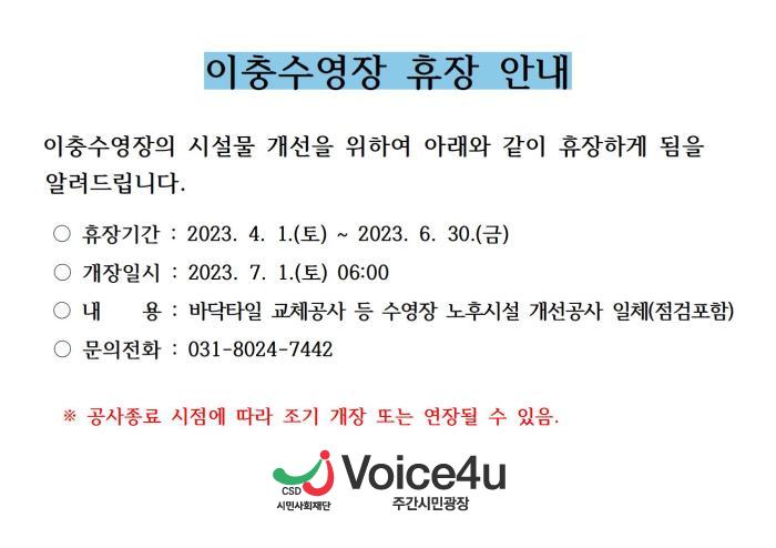 평택시 이충문화체육센터 수영장이 낡은 시설 개선을 위하여 오는 4월 1일부터 6월 말까지 약 3개월간 임시휴장에 들어간다.