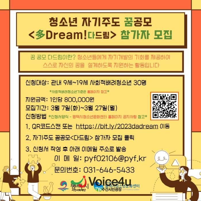 평택시(시장 정장선)가 주최하고 평택시청소년문화센터가 주관하는 사회적 배려 청소년 대상 자기주도 꿈 공모 <다드림> 사업 참가자를 오는 27일까지 모집한다.