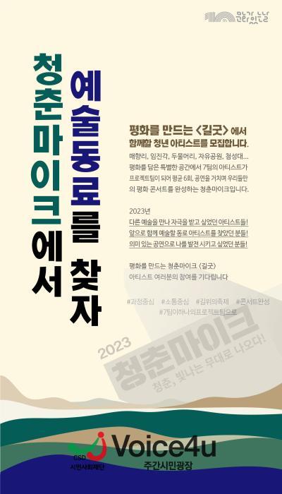 지난해 청춘마이크 <길굿 프로젝트>를 진행했던 문화발전소 열터는보다 확장된 평화 정신의 <길굿>과 사업비 334백만 원으로 15개의 시·군에서 청년예술가 20팀과 함께 연간 120회의 거리 공연을 선보일 예정이다. 청년 예술가가 공연하게 될 장소로는 화성의 매향리와 봉담·동탄호수공원, 파주 임진각, 당진 삽교호함상공원, 경주 첨성대, 여수 이순신광장, 대천 해수욕장, 태안 만리포해수욕장, 양평 두물머리 등이 있다.