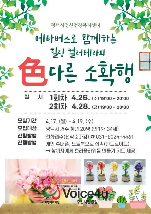 평택시정신건강복지센터에서는 평택시 거주 청년(만 19세~34세)을 대상으로 메타버스(비대면) 힐링컬러테라피 「色다른 소확행」을 오는 26일(수), 28일(금) 총 2회 진행할 예정이다.