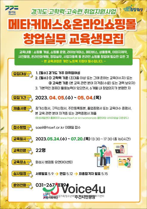 재단법인 화성시여성가족청소년재단(대표이사 김경륜) 화성여성새로일하기센터는 경기도와 화성시가 지원하는 고학력·고숙련 취업지원사업으로 ‘메타커머스&온라인쇼핑몰창업실무’ 교육생을 5월 4일까지 모집한다.