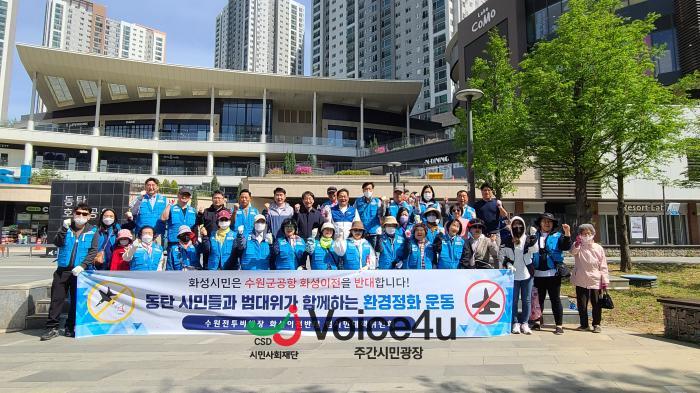 수원전투비행장 화성이전반대 범시민대책위윈회(이하 ‘범대위’)는 22일 지구의 날을 기념해 화성시 동탄2신도시에 위치한 동탄호수공원에서 환경정화 활동 및 수원 군공항 화성시 이전 반대 서명운동을 개최했다.