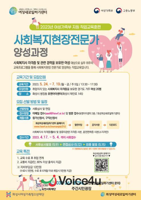 (재)화성시여성가족청소년재단(대표이사 김경륜) 화성여성새로일하기센터는 여성가족부가 지원하는 직업교육훈련으로 ‘사회복지사현장전문가 양성과정’ 교육생을 2023년 5월 4일(목)까지 모집한다.