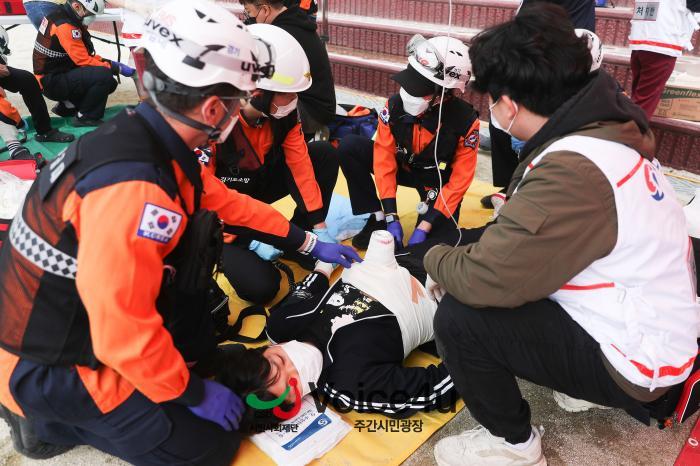 ‘다수사상자 대응’ 상황에서는 구급대원이 심정지 환자를 소생시키기 위해 영상 의료 지도 실시, 폭발 시 허리 중증환자 응급처치, 복부 관통에 따른 과다출혈 압박 지혈, 우측 종아리 개방성 골절환자 응급처치 등 다수사상자 발생 상황에 대응했다. 의정부성모병원 등 구급 인력들은 현장 응급의료소 내에서 중증도 분류 및 응급처치 후 병원으로 이송하는 훈련을 실시했다.