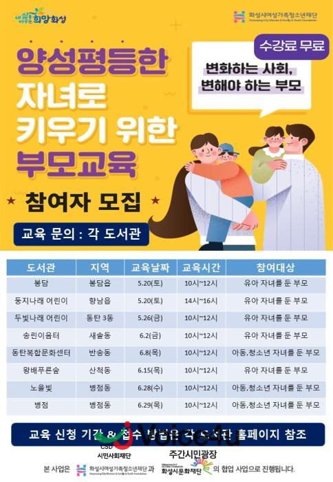 (재)화성시여성가족청소년재단(대표이사 김경륜) 화성시여성비전센터는 (재)화성시문화재단 도서관과 함께 운영하는 ‘양성 평등한 자녀로 키우기 위한 부모 교육’을 오는 20일부터 시작해 8회 운영한다고 밝혔다.