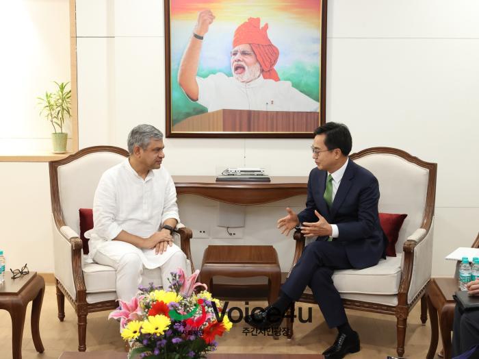 김동연 경기도지사는 현지 시각 4일 오후 뉴델리의 인도 철도본부 청사에서 아쉬위니 바이쉬나우(Ashwini Vaishnaw) 인도 전자정보기술부 장관을 만났다.