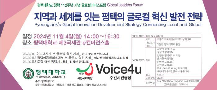 글로컬리더십포럼은 11월 4일 평택대학교 e컨버전스홀에서 문국현 박사를 기조연설자로 초청해 “지역과 세계에 잇는 평택의 글로컬 혁신 발전 전략”을 주제로 다루었다. 자정 능력 있는 도시 만들기가 본 포럼의 핵심가치였다. 건물과 같은 하드 파워 쪽에서 보면 평택은 정말 놀라울 정도로 많이 변화했다. 그러나 소프트 파워인 갈등 조정 능력이라든가 배려와 같은 휴먼 캐피탈 자본은 취약한 상황이다. 지뢰밭 사회가 될 정도로 삭막해진 사회의 흐름에 제동을 거는 역할이 글로컬리더십포럼의 앞으로 과제다. 한국에 226개 시군 중 과연 자생력 있는 도시가 몇 개 있을까 의문을 갖고 평택대학을 중심으로 시민사회가 결집해 어떻게 평택을 자정 능력 있는 도시로 만들고 타도시로 이를 어떻게 확산하느냐 라는 문제의식이 본 포럼의 무게감을 주고 있다.