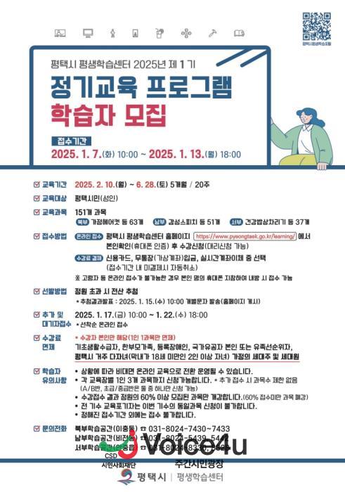 평택시(시장 정장선)는 1월 7일부터 13일까지 평생학습센터(북부, 남부, 서부)의 ‘2025년 제1기 정기교육 프로그램’ 수강생을 모집한다.