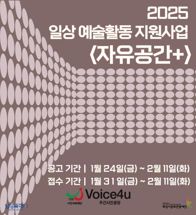(재)화성시문화관광재단(대표이사 안필연, 이하 ‘재단’)은 오는 1월 31일부터 2월 11일까지 「일상 예술활동 지원사업 <자유공간+>」 공모를 진행한다. 이번 공모는 일상 공간에서 시민 참여형 예술 프로젝트를 지원하여 지속 가능한 지역 문화예술 활동 기반을 마련하고자 시작되었다.
