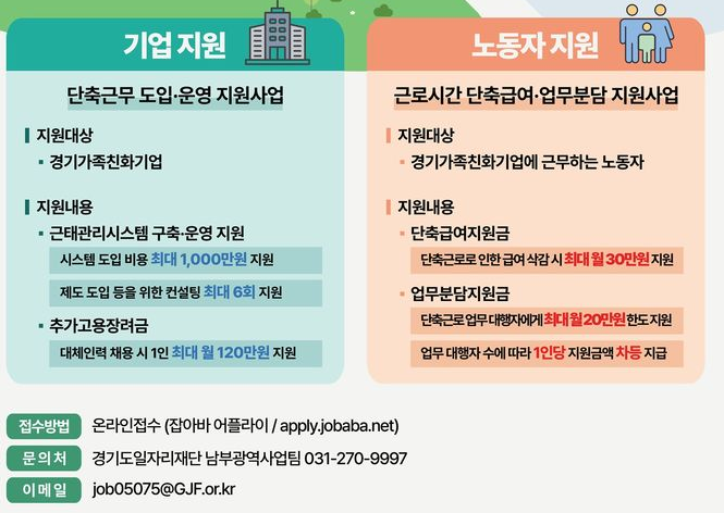 경기도와 경기도일자리재단은 기업이 근로시간 단축 제도를 도입할 때 발생하는 부담을 줄이기 위해 컨설팅·인프라 구축·인력 지원 등 단계별 지원 체계를 마련했다고 밝혔다.