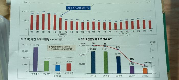 ▪현대제철 박경언 환경보전팀장은 “3개 소결 배가스청정설비 개선을 완료하여 오염물질인 황산화물(SOx), 질소산화물(NOx)의 배출농도는 법기준대비 약 35% 수준으로 배출하고 있으며, 다른 시설들은 배출허용기준의 약 25% 미만으로 배출하고 있다. 제철소 대기오염물질 배출량은 2019년 17,832톤에서 2020년 7,720톤으로 올해는 5,500톤으로 전년대비 28.8%로 저감될 것으로 예상된다. 2016년 23,477톤 대비하여 올해는 77% 저감될 것으로 보인다. 2017년부터 현재까지 환경개선투자에 5,281억원을 투입했으며, 향후 코크스 건식소화설비 설치 3천억원과 코크스와 가열로 방지시설 설치에 2천억원 등 총 1조5천억원이 투입된다. 아울러 대기오염물질 배출농도를 실시간으로 공개하고 있으며, 환경부 대기오염물질 웹사이트와 당진시 홈페이지를 통해 공개하고 있다. 제철소 환경전광판도 이달 중 설치 운영된다.”고 보고했다.